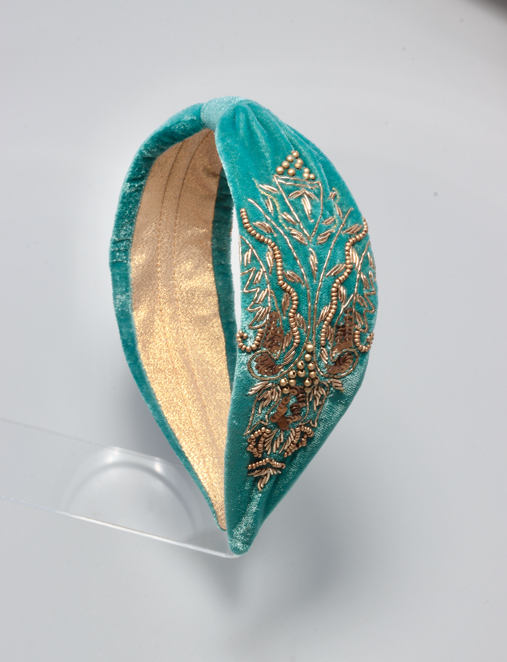 ANITA BRAND TEAL VELVET HEADBAND WITH GOLD AND BRONZE BEADS