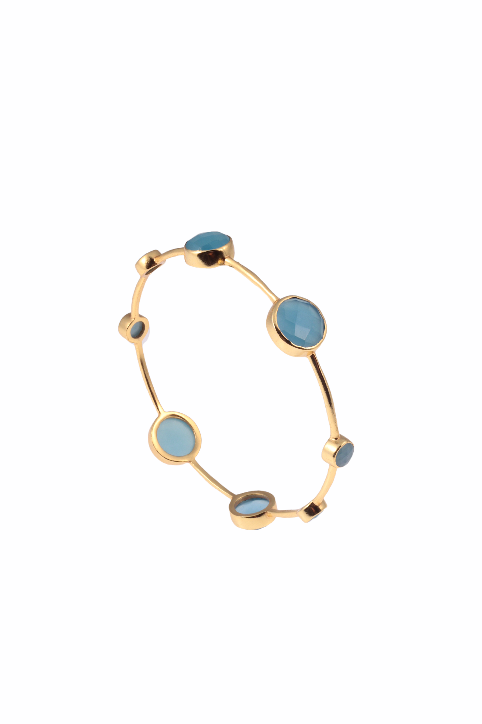 925 sterling silver, 18K gold plated, handcrafted bangle decorated with eight blue chalcedony gemstones.