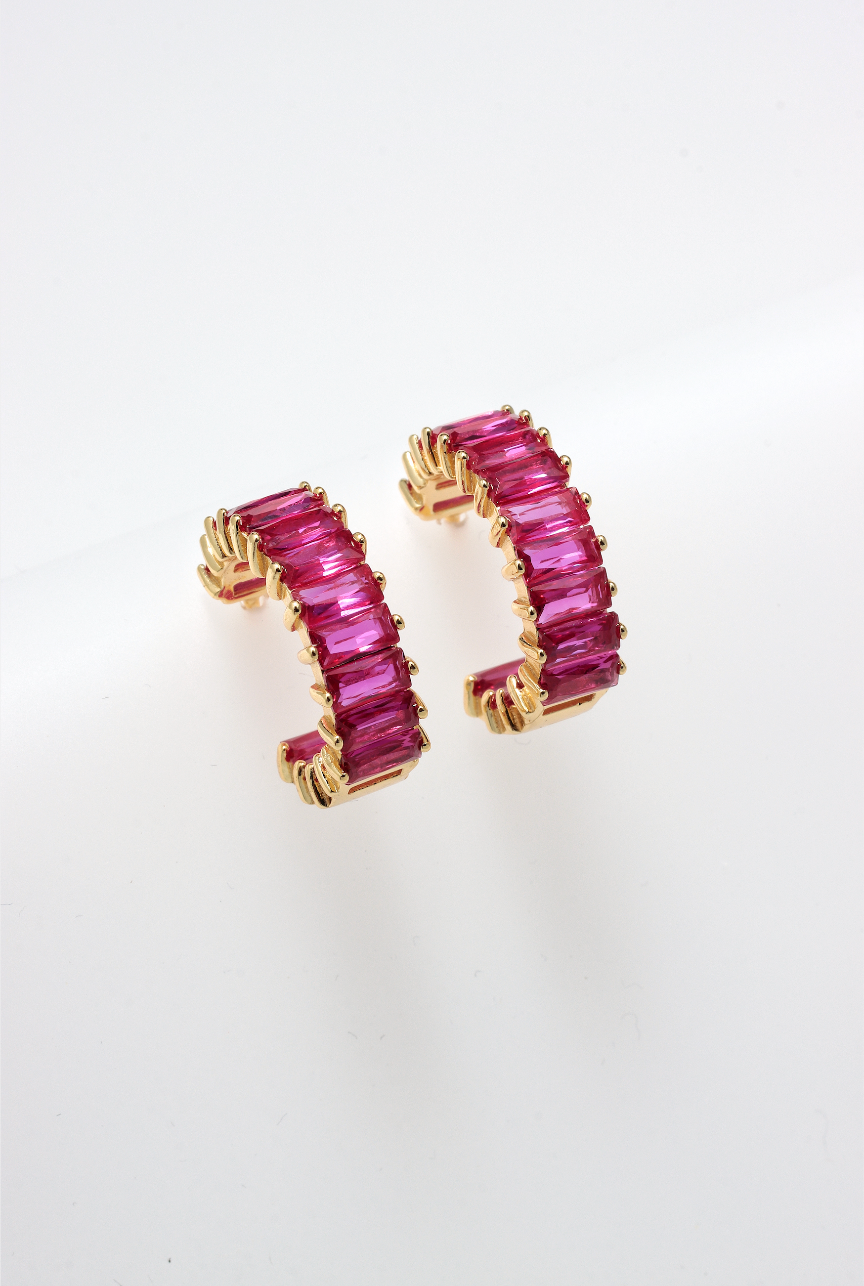 Levin 925 sterling silver huggie earrings, gold plated decorated with magenta zirconia stones.