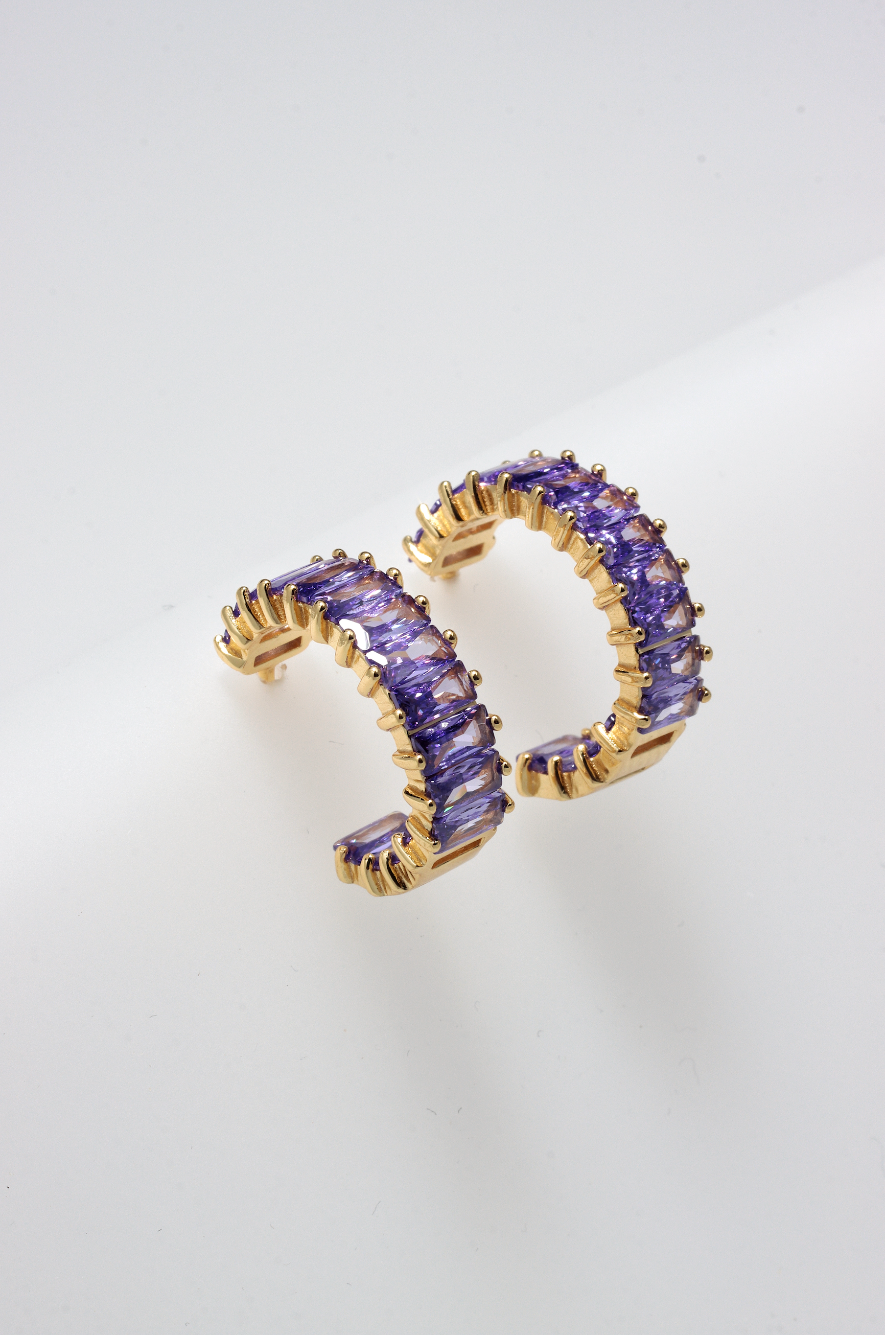 Levin 925 sterling silver huggie earrings, gold plated decorated with violet zirconia stones.