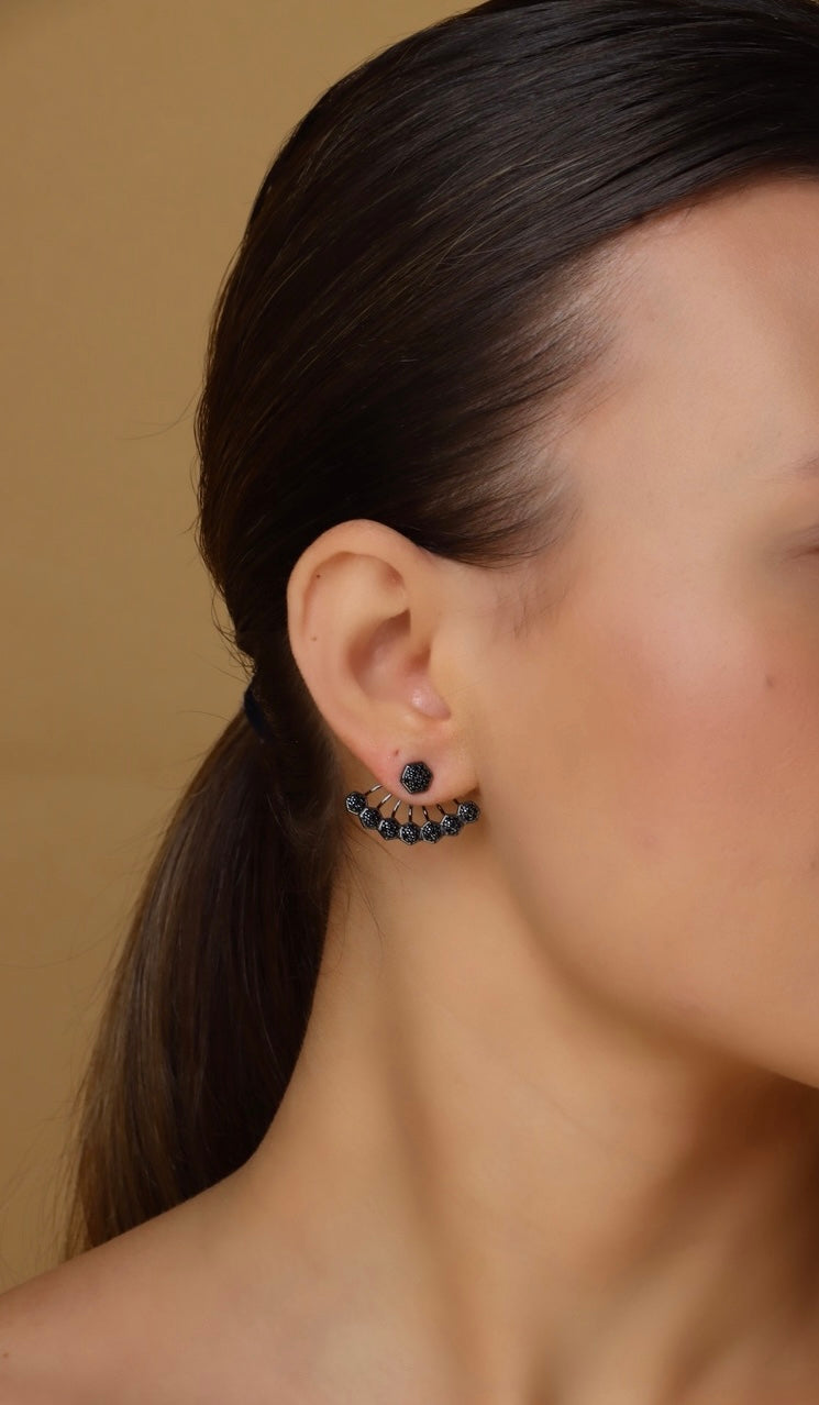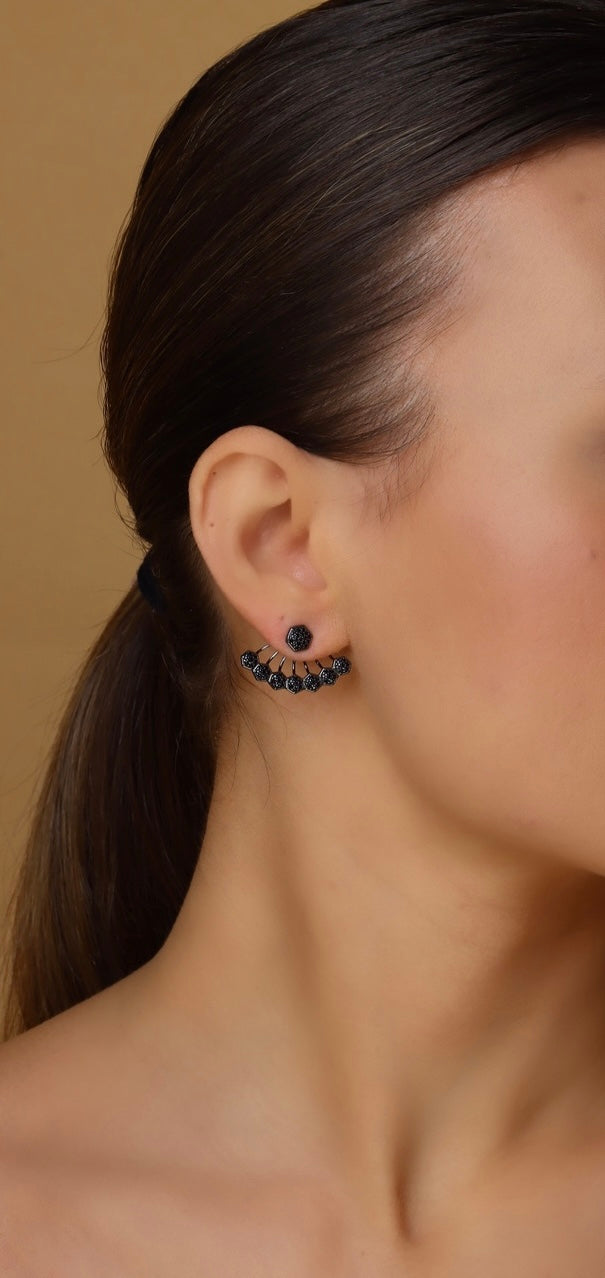 VALERIA BLACK, hexagon black plated 925 sterling silver ear jacket earrings decorated with AAAAA+ quality white round cut zirconia stones.Adjustable back with holes for the stud clasp.