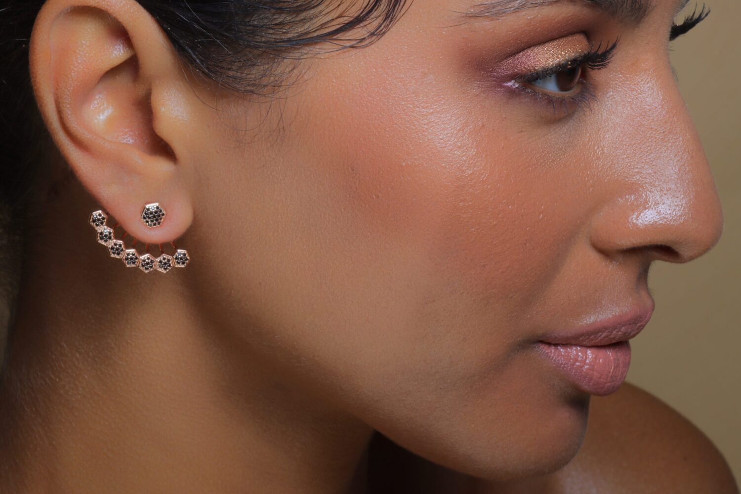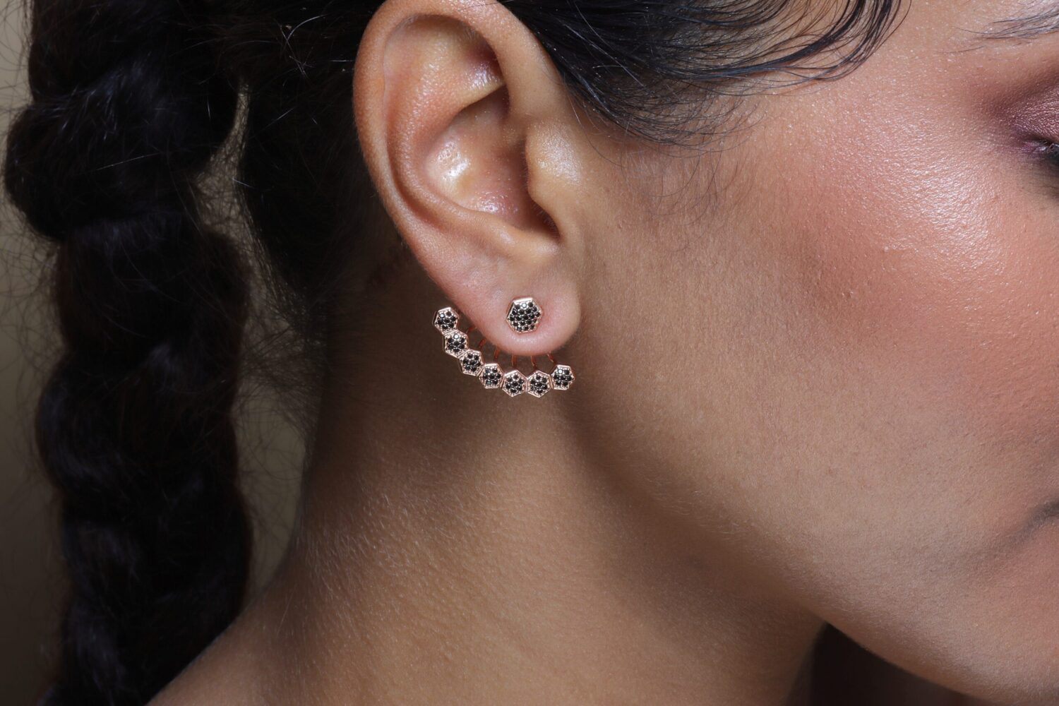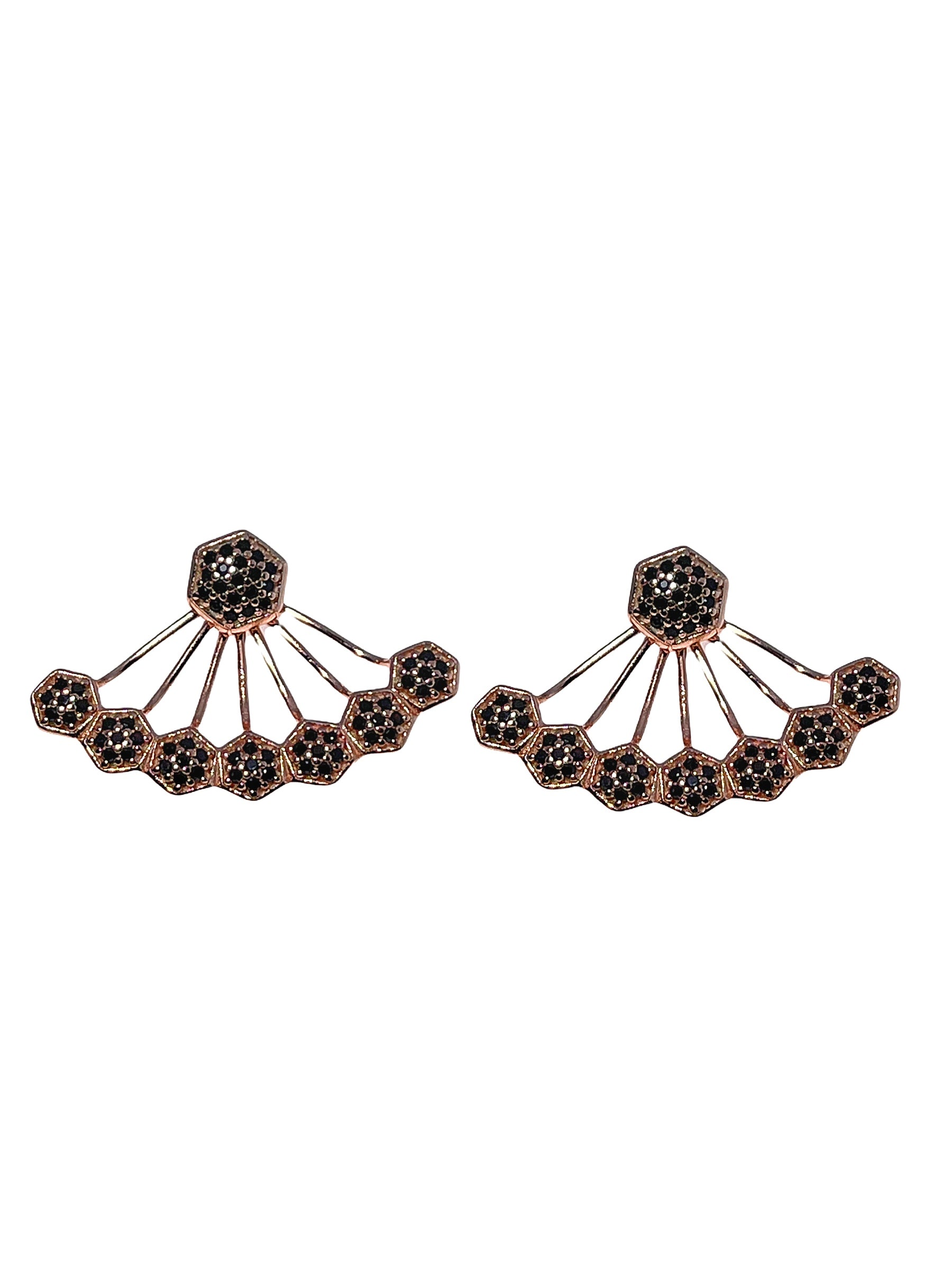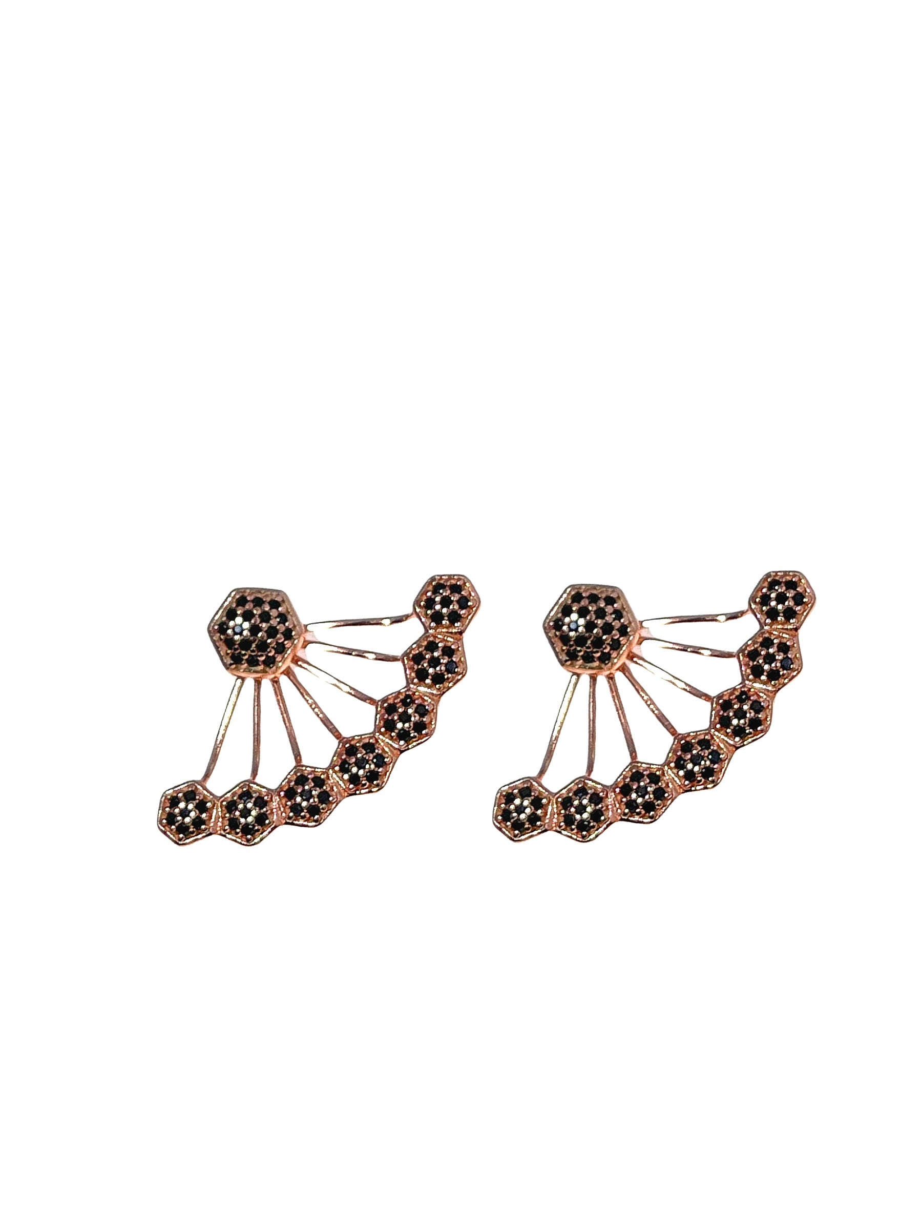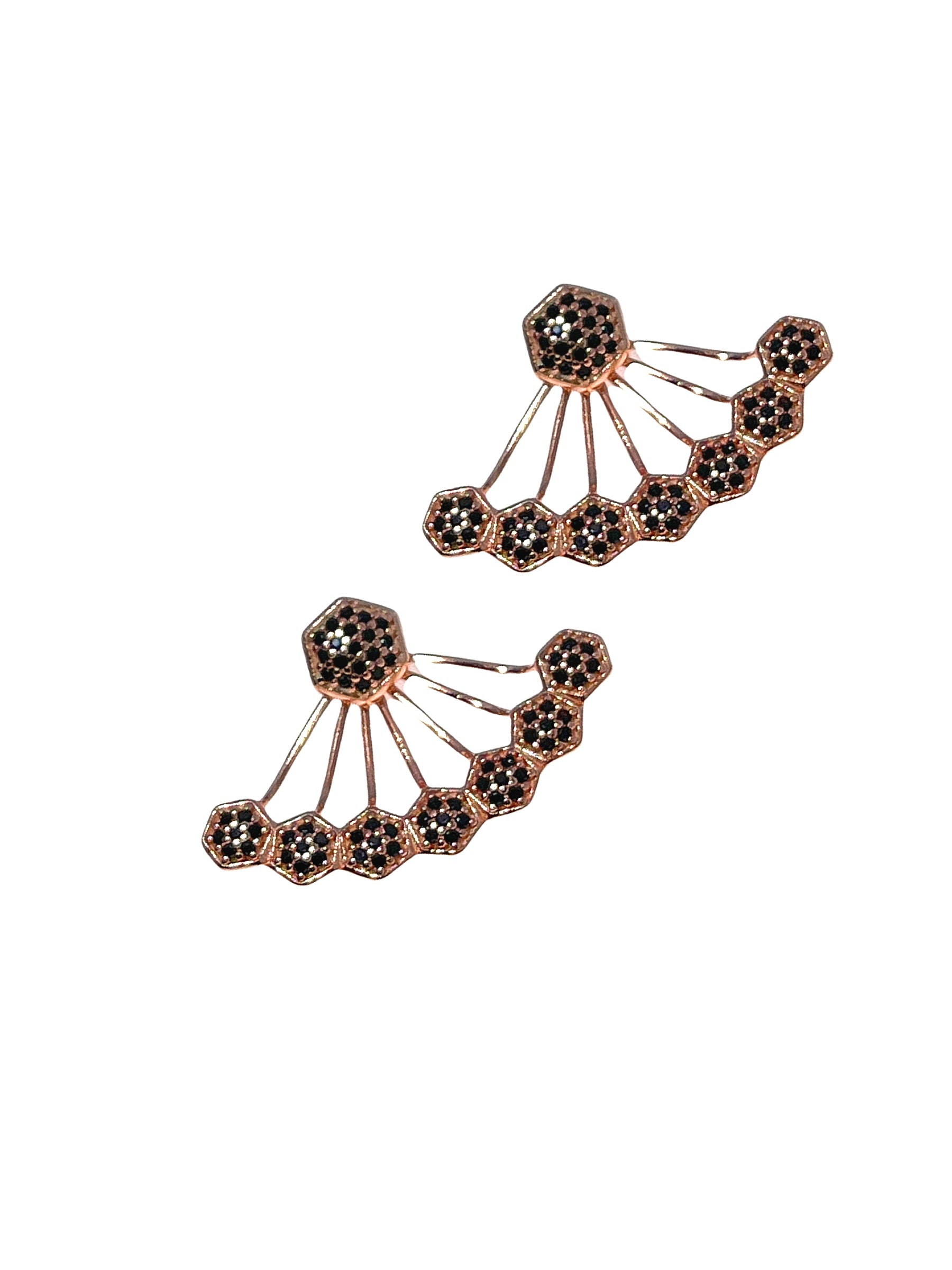 VALERIA ROSE BLACK, hexagon rose gold plated 925 sterling silver ear jacket earrings decorated with AAAAA+ quality black round cut zirconia stones.Adjustable back with holes for the stud clasp.