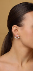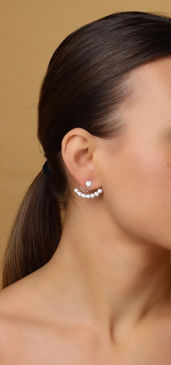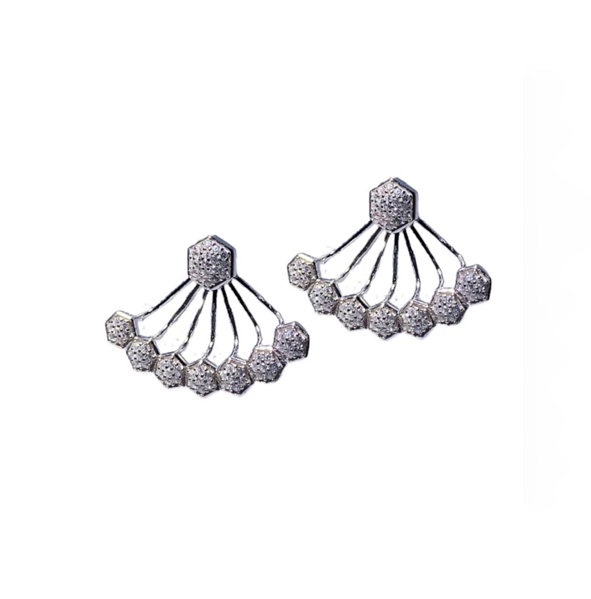 VALERIA SILVER, hexagon silver plated 925 sterling silver ear jacket earrings decorated with AAAAA+ quality white round cut zirconia stones.Adjustable back with holes for the stud clasp.