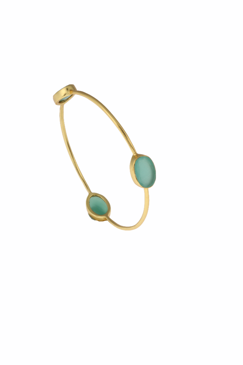 925 sterling silver, 18K gold plated, handcrafted bangle decorated with three aqua chalcedony gemstones.